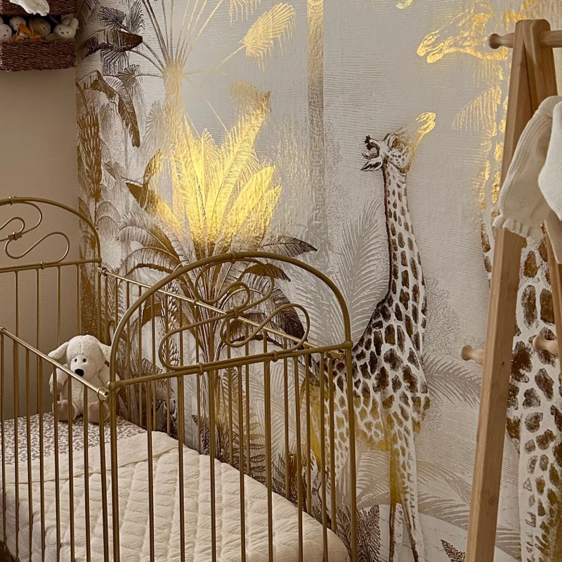 Give your nursery a stylish and luxurious look with our exclusive Giraffe & Swinging Monkeys wallpaper, fully crafted in gold foil! This is not a metallic gold effect but a beautifully reflective golden print that creates an elegant and warm result.